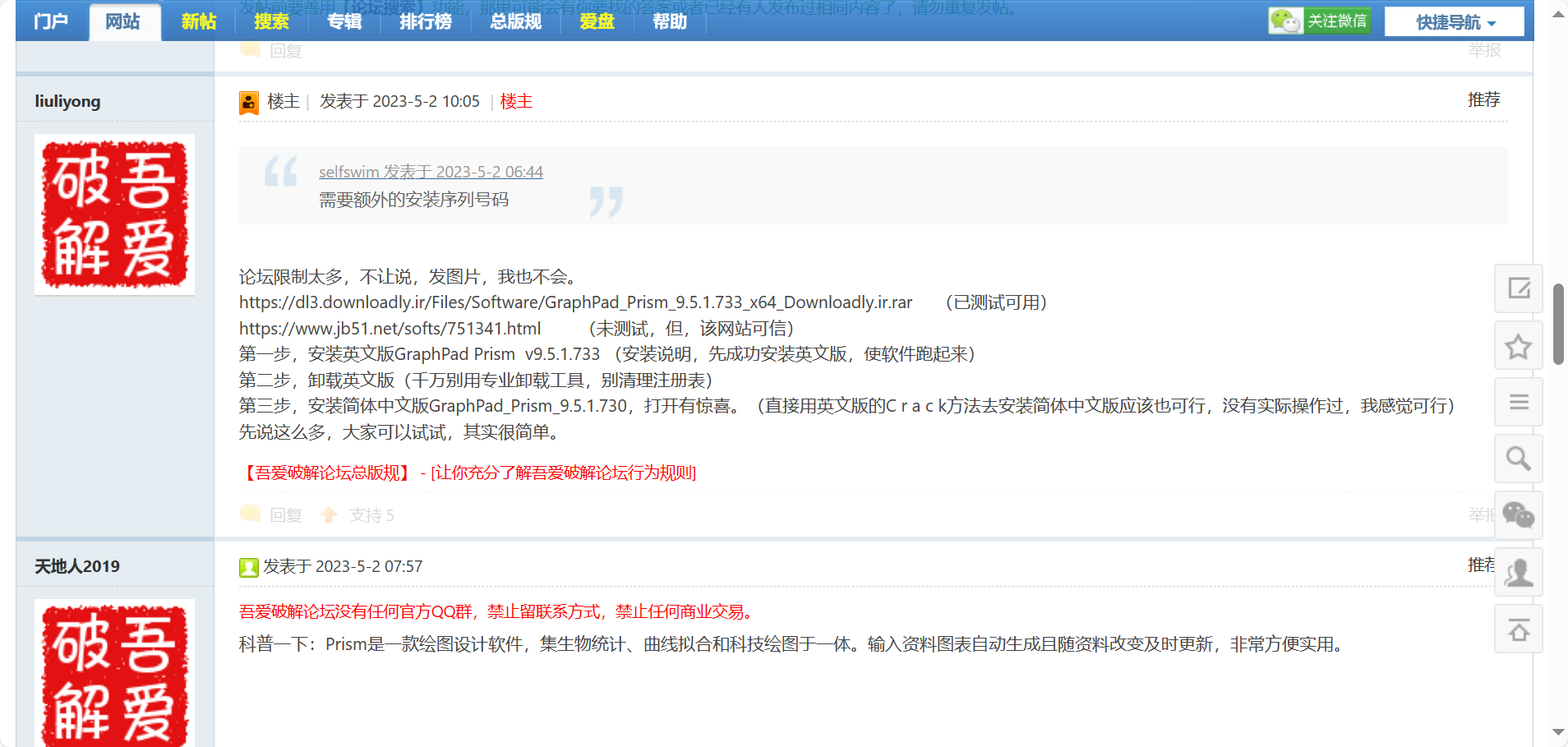 支持序列号破解和crack替换安装(实测使用序列号安装有效,需关闭杀毒软件和Windows安全防护,crack文件不太行),然后需要在控制面板断掉graphpad的联网(非常重要!!!),操作教程见Prism9破解版下载 GraphPad Prism(医学绘图软件) v9.5.1.733 免费安装破解版(附安装教程) 下载和win7/win10系统防火墙禁止单个应用联网步骤 禁止软件上网快速搞定,即可正常使用。