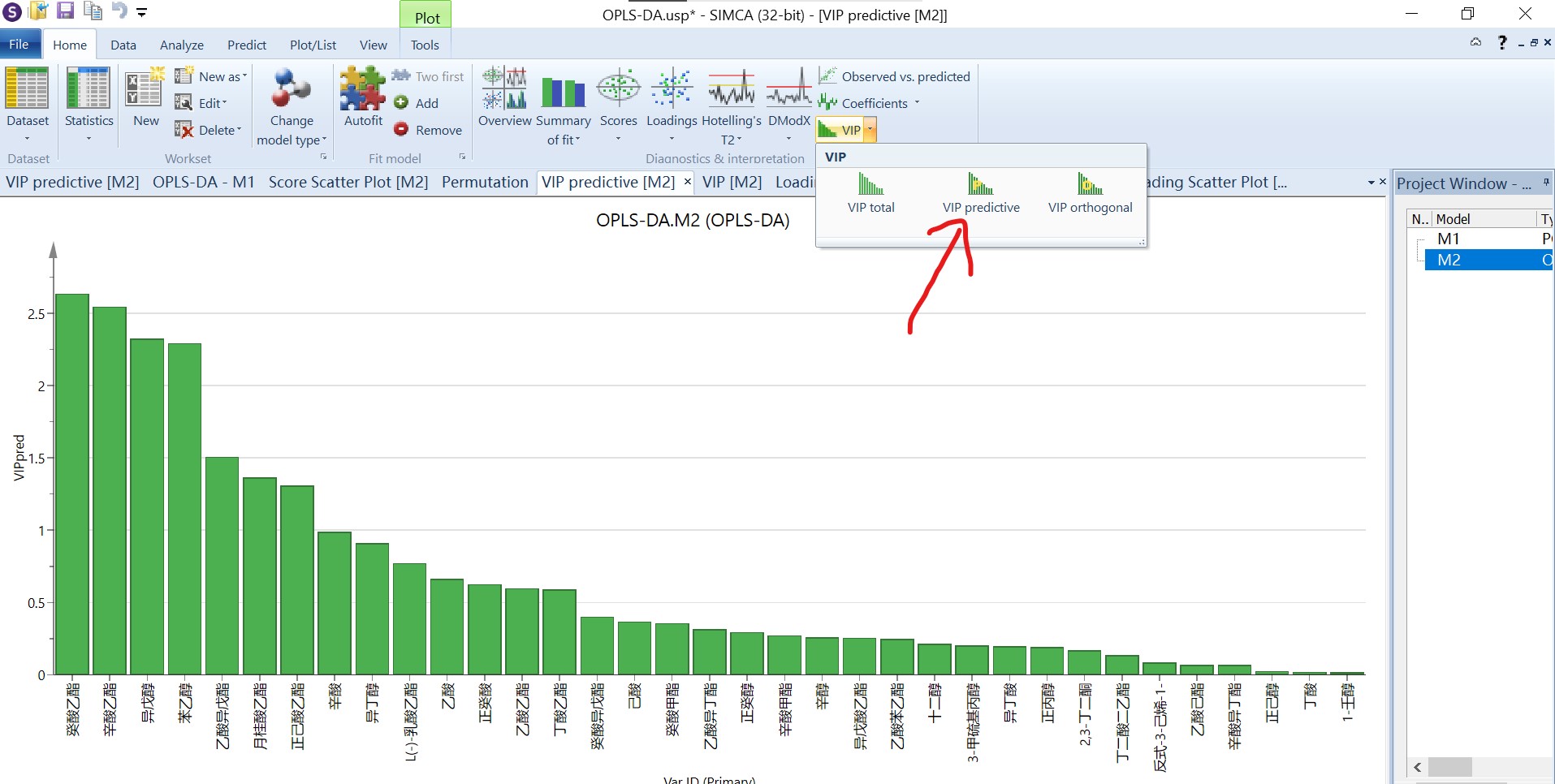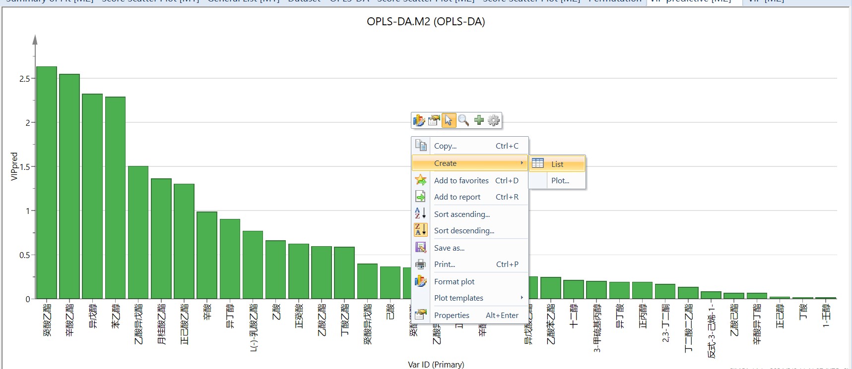 最后计算“VIP”值,“home”栏点击“VIP”旁边小三角,选择“VIP Predictive”(PLS-DA只有VIP total,OPLS-DA都有,但要用VIP Predictive),右键“create”→“list”可导出数据到origin等软件中重新作图。VIP值越大,代表该物质对于区分两组所具有的贡献越大,一般认为,VIP值大于1的代表这种物质的组间差异显著。如果想进一步提取p<0.05的差异成分,这里可以利用插件omics计算(参考SIMCA14.1的基本操作(包含p值、vip值、置换检验等,插件下载链接: https://pan.baidu.com/s/1JJouwcYVulklO0CMW0VorQ?pwd=9527 提取码: 9527