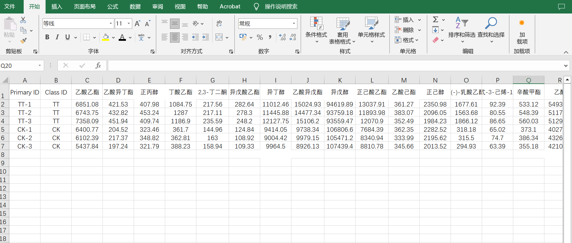 如图在excel表中列好数据,第一列Primary ID 为样品名称,第二列Class ID为样品组的分类,然后是各项指标(省的在软件里面设置分组了)。