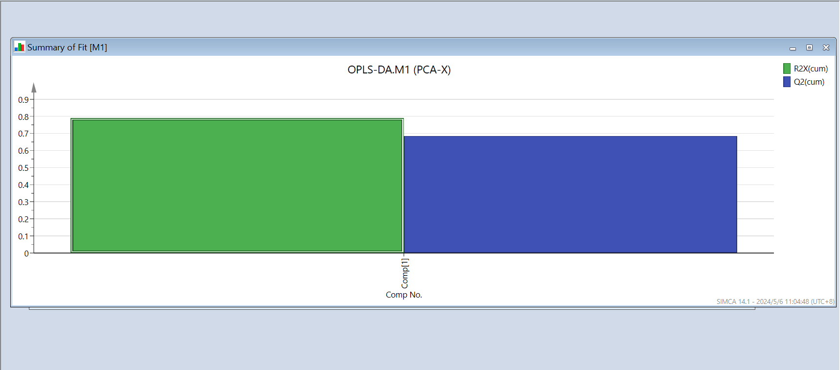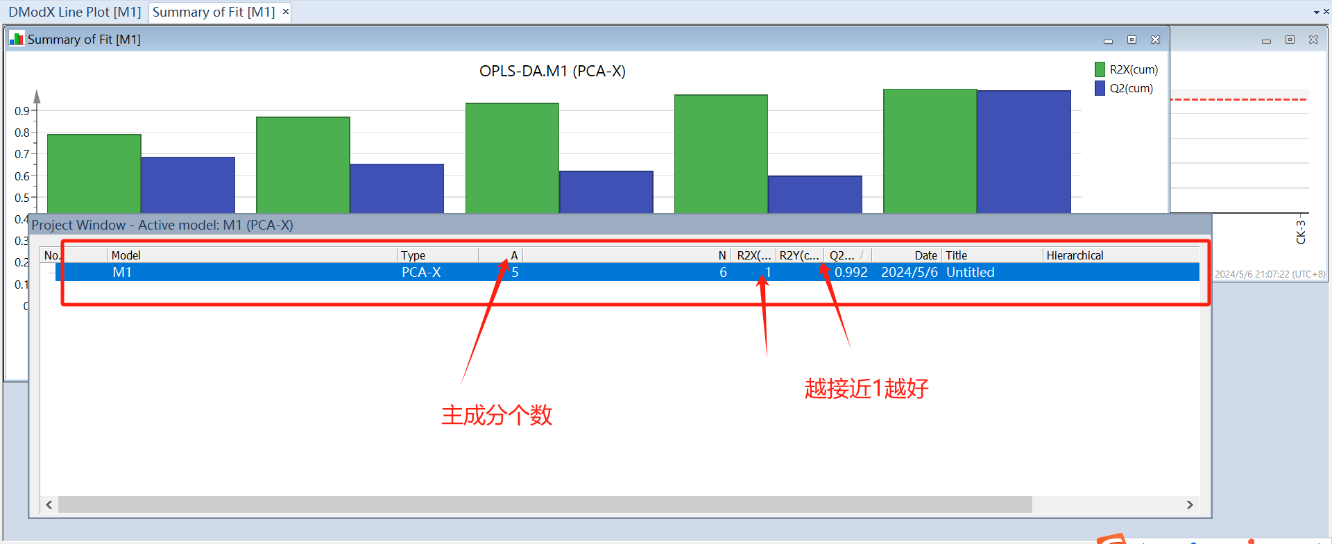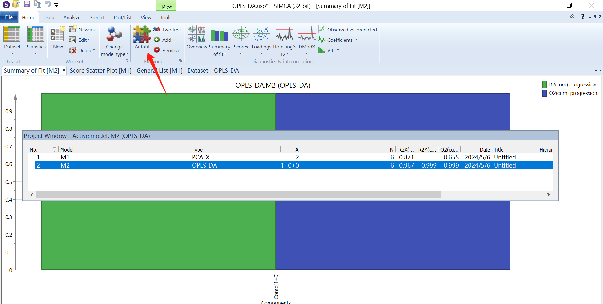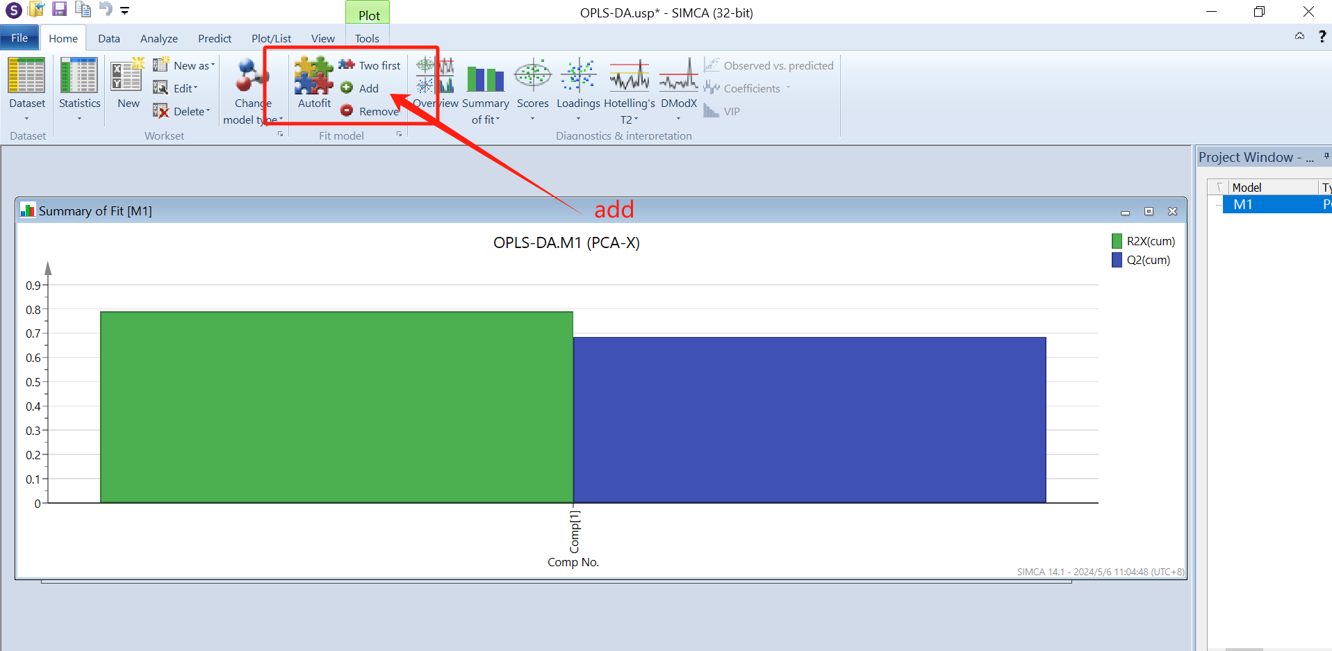 分析完会弹出一个对话框M1(PCA-X),即交叉验证的结果,选中M1点击上方菜单栏的Autofit(自动拟合),则出现一个柱状图,点击“add”即增加一个主成分,这里根据R2X、R2Y和Q2的值来选择(add or remove)主成分的个数,最少为2个,且都要满足>0.5。