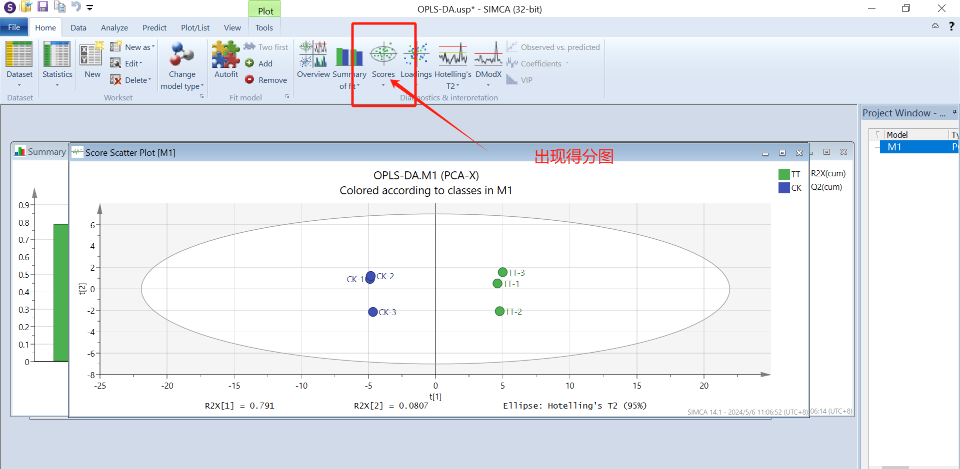 得分图可以看两组样品是不是分得很开,存不存在差异,横坐标表示预测成分得分值,横坐标方向可以看出组间的差距;纵坐标表示正交成分得分值,纵坐标方向可以看出组内的差距;百分比表示成分对数据集的解释度。