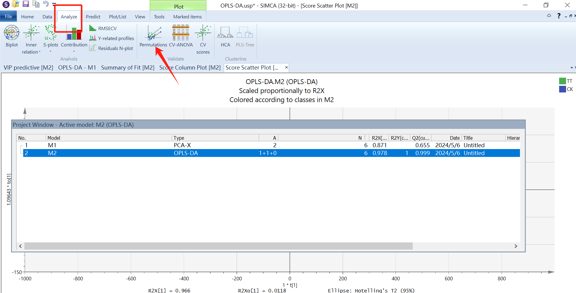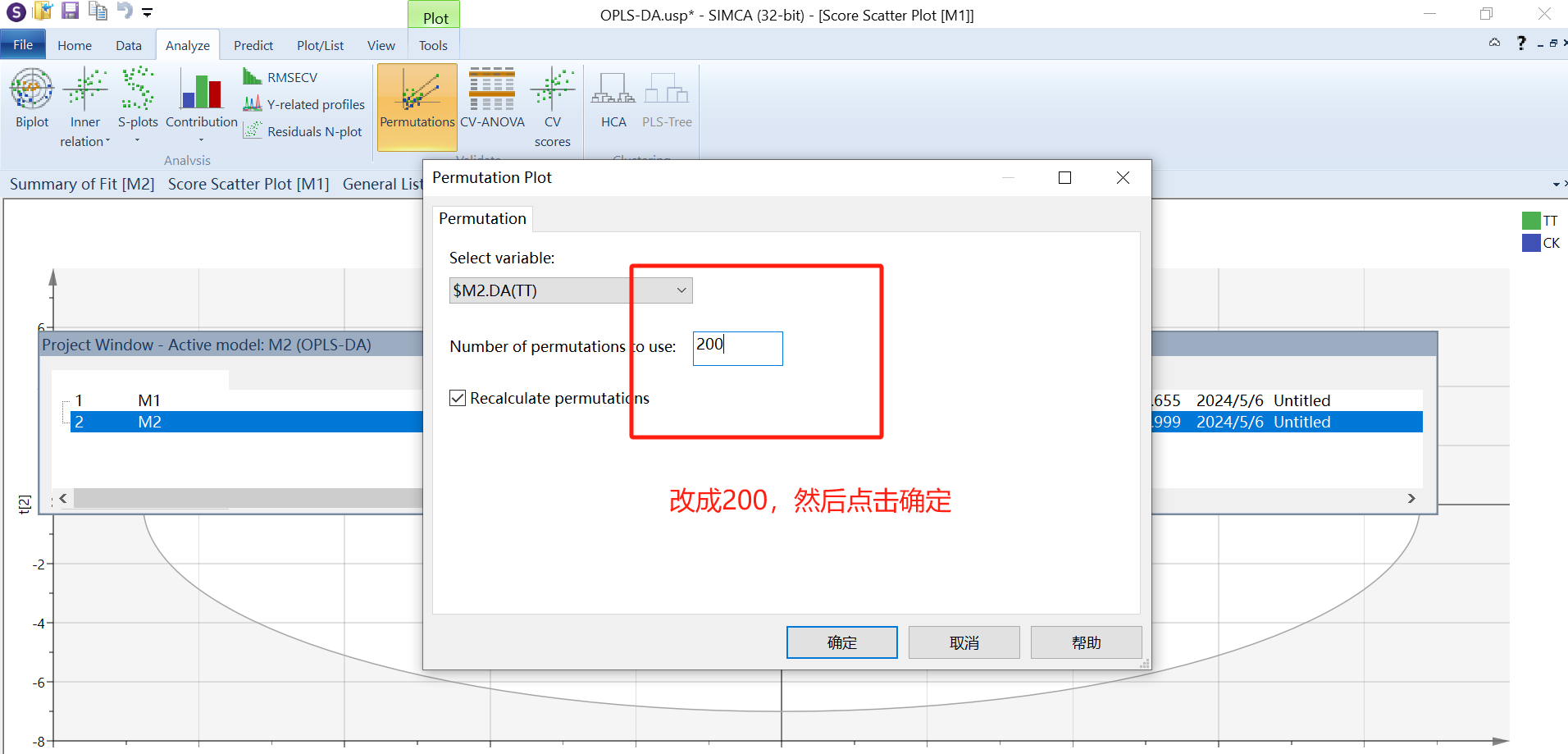 接着需要对OPLS-DA结果进行置换检验(permutation test),判断模型是否存在“过拟合”。选中项目M2,点击“analyze”界面的“permutations”,将20更改为“200”,然后确定。