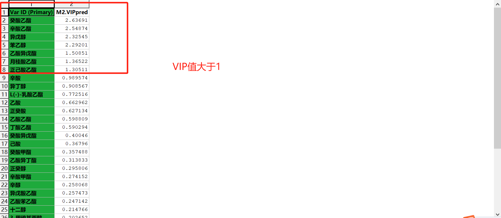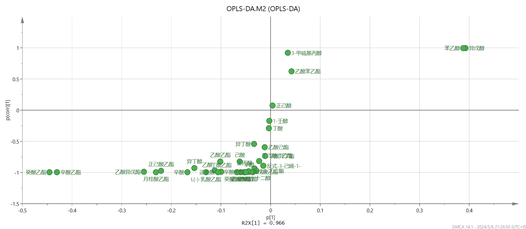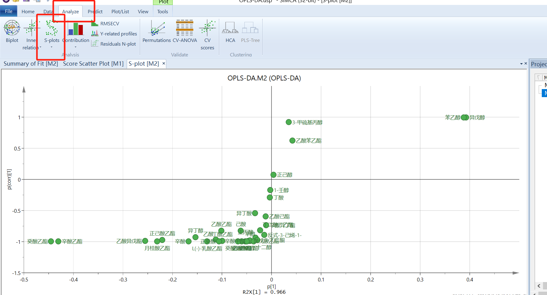“s-plot”图的横坐标表示主成分与各类成分的协相关系数,纵坐标表示主成分与各类成分的相关系数,越靠近右上角和左下角的成分其差异越显著,其作用和VIP值图相同,二者选其一就行。