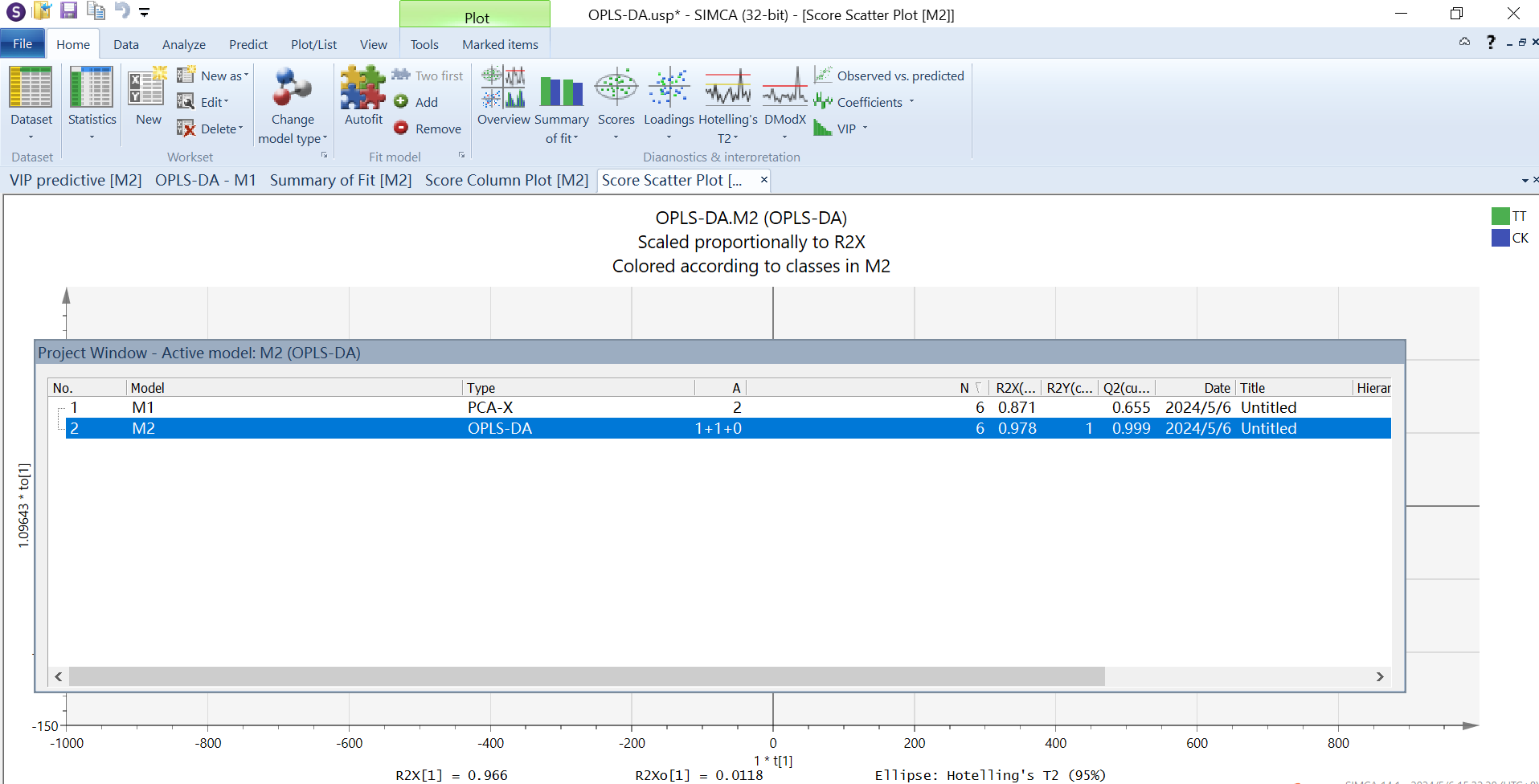 在进行OPLS-DA分析前,顺便学习下PCA(主成分分析)的操作。先选中CM1项目,点击上方菜单栏的“new”,这里我们选择Scale方式为Par,下方“model type”选择“PCA-X”,确定完成分析。Ctr是将原数据转化成离原点更近的新数据,Ctr=x-x拔;UV是将所有变量拥有同等的重要性,UV=x-x拔/SD;Par相比UV更接近原始测量数据,Par=x-x拔/根号SD,可以根据数据情况选择合适的Scale方式。