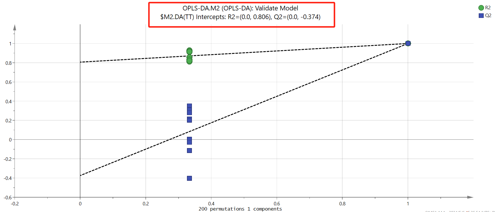 判断条件:1. 原始的R2Y和Q2Y(最右边的两个点)总是大于左边那些置换后对应的值(左边那些散点)。2. 看截距,根据经验判断,优秀的模型R2Y的截距不超过0.3-0.4,Q2Y的截距不超过0.05(通常为负值)。但在实际项目中,能满足两条斜线的斜率为正,且Q2Y的截距不超过0.05就可以了。
