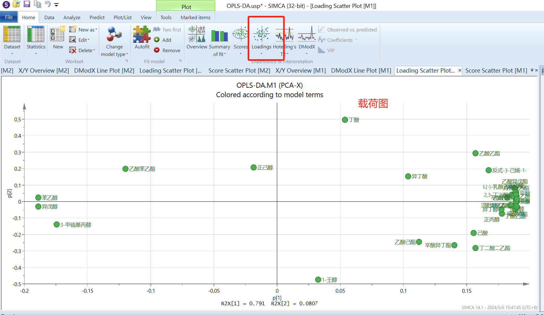 根据图片进行操作,“scale”中全设置为par(较UV而言,Par处理后模型对数据的敏感度更高),“model type”选择“OPLS-DA”,然后自动拟合,“add”一个主成分(这里仅两个主成分的R2Y和Q2值就很高),点击“score”和“loadings”生产得分图和载荷图。