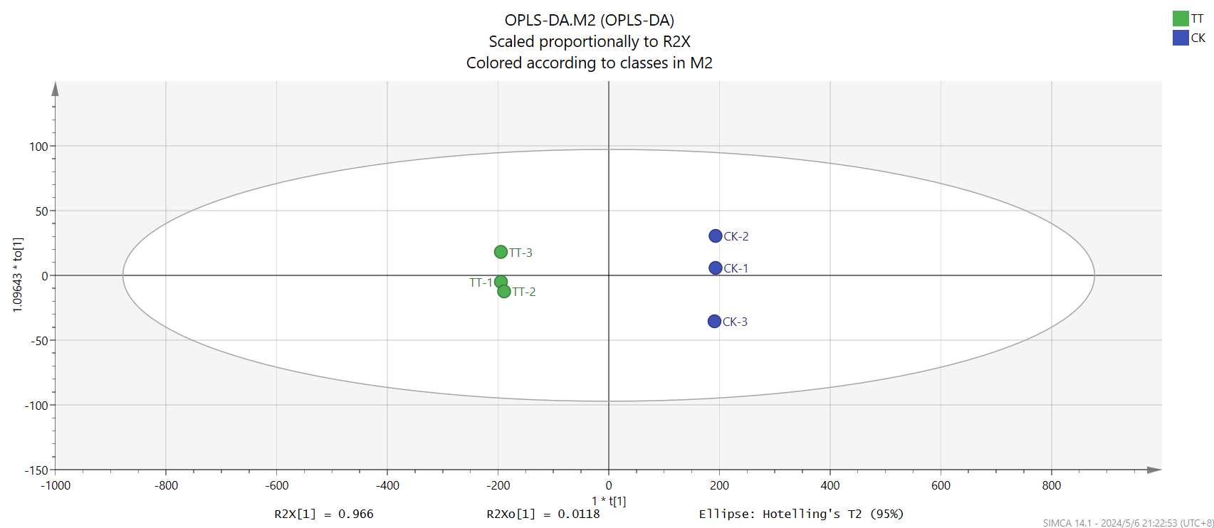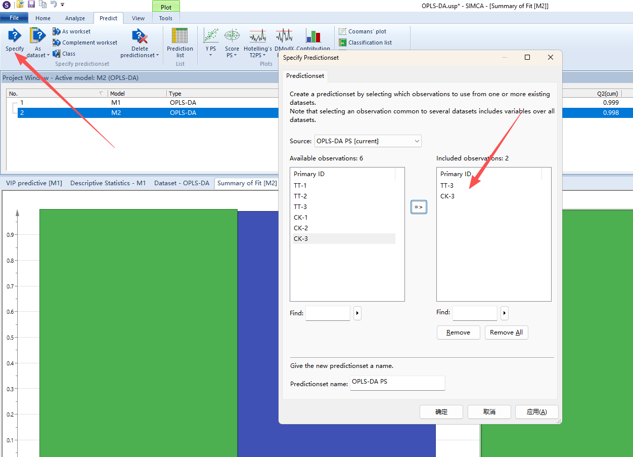 OPLS-DA除了能对现有分组数据进行差异化分析外,还能根据现有数据集进行分类预测,判断未知量是否属于现有分类组别,从而应用于产品分级、品种鉴定、产地溯源等分类判别场景。还是以上文数据为基础,先确定训练集与测试集,将TT-3与CK-3划为测试集,其余为训练集,那么我们就是以TT-1、TT-2、CK-1、CK-2为训练集进行OPLS-DA建模,然后用测试集来验证模型的预测能力。操作如下图所示,模型分类的正确率为100%,可以说明模型的预测能力较好,当然我们的数据量本身较少,存在假阴性,实际意义不大。因此OPLS-DA模型的训练集数据每组的样本量应该>30,这样的模型才比较可靠。