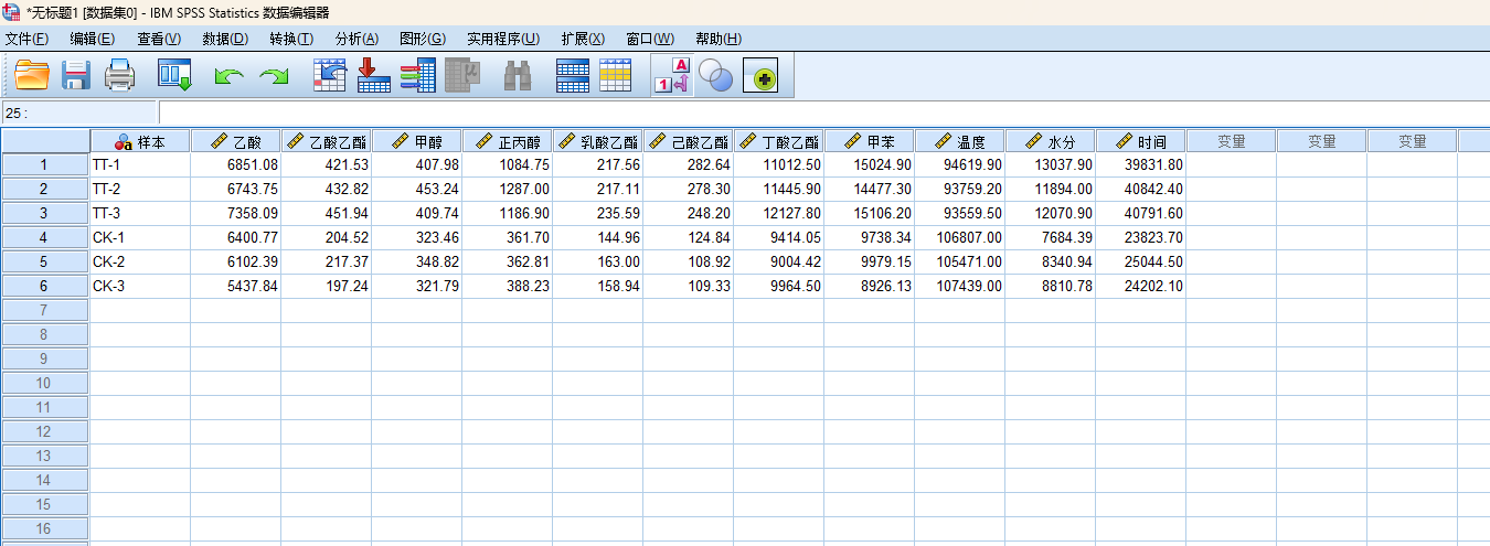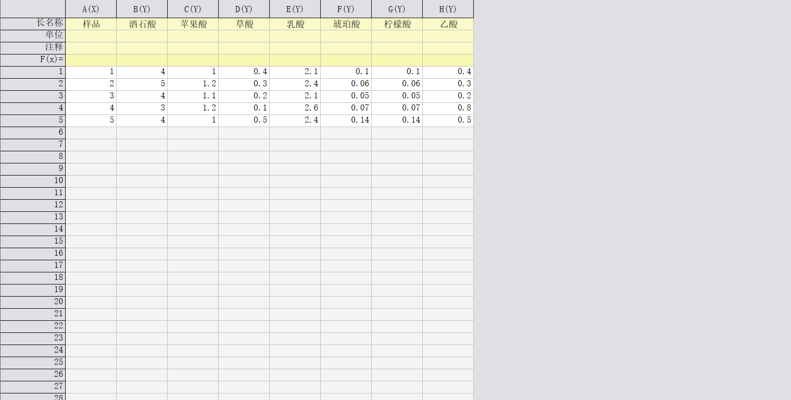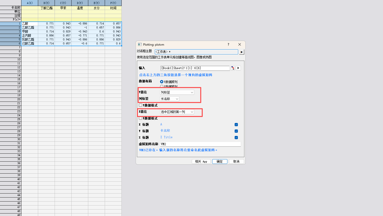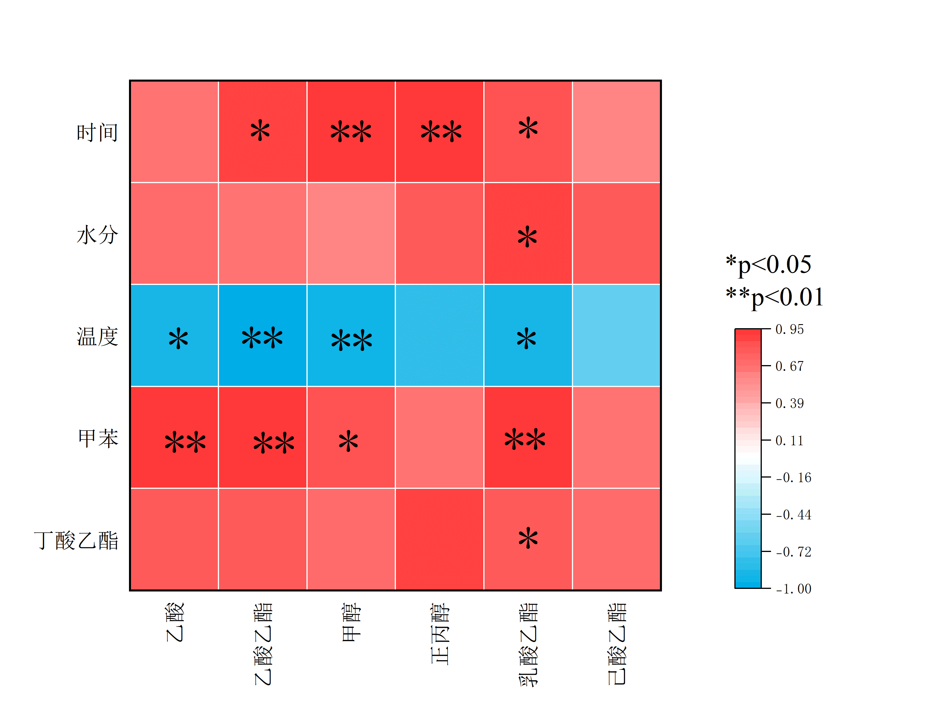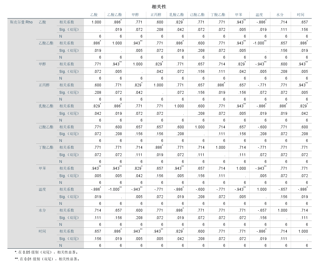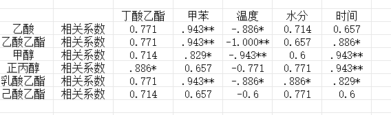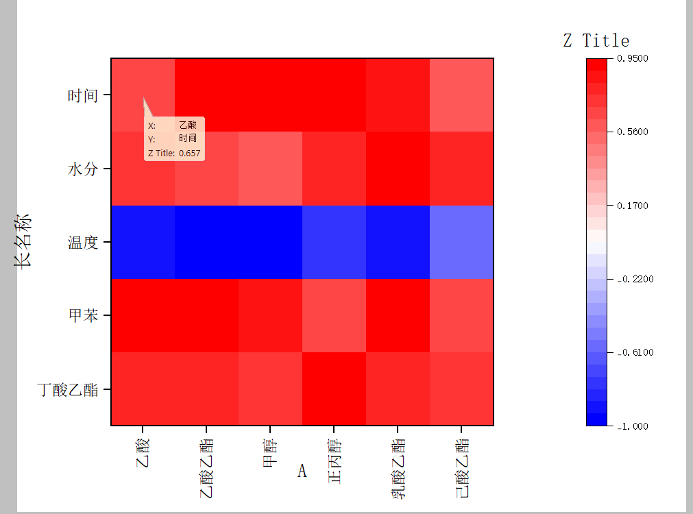这里我们只想分析丁酸乙酯、甲苯、温度 、水分、时间与乙酸、乙酸乙酯、甲醇、正丙醇、乳酸乙酯、己酸乙酯的相关性,于是精简了表格的数据,然后再导入到origin中作图。origin中选择所有数据,点击绘图→等高线图→热图,然后选择Y轴与X轴的标签范围,确认绘图,最后进行下图形的美化(添加下网格线,更改颜色与级别)即可得到一张满意的相关性热图了。