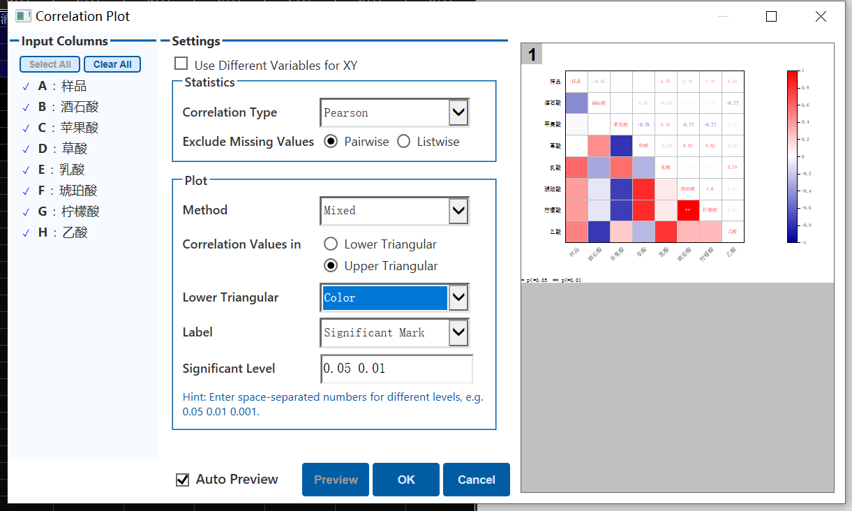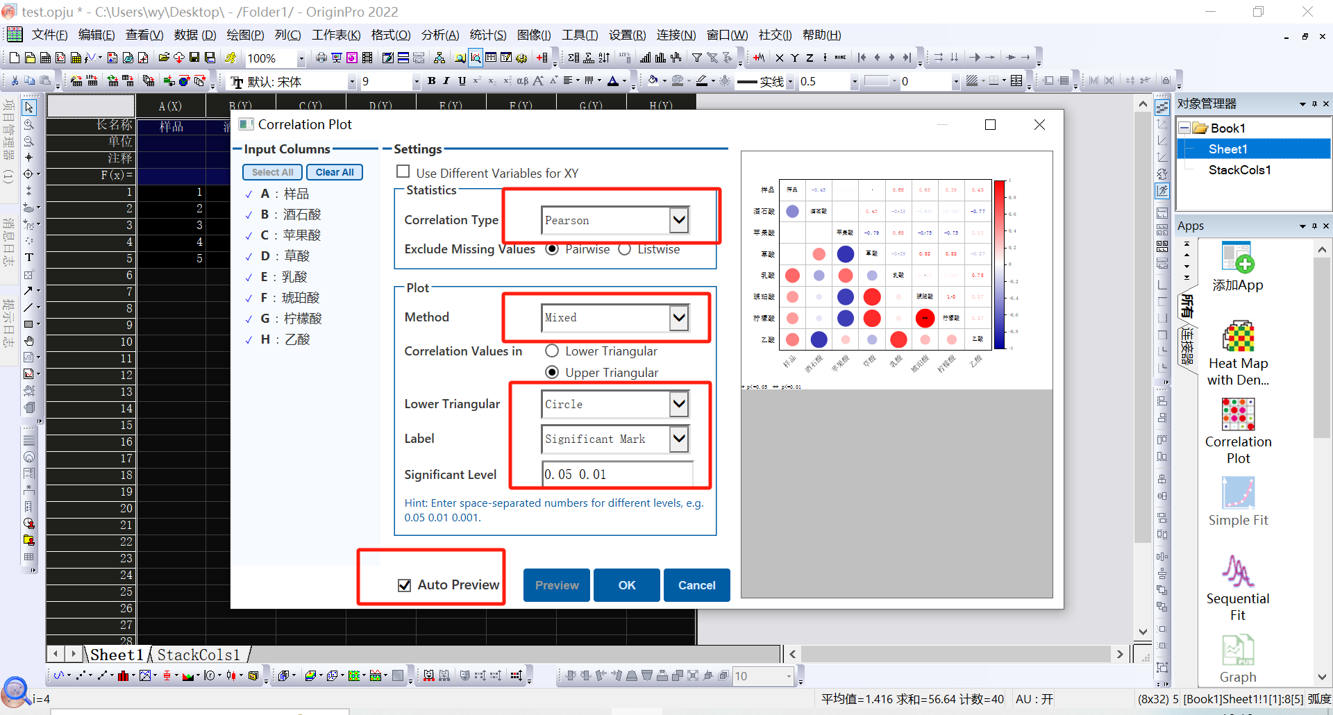 全选数据点击右边app的Corelation Plot 进行绘图,选择相关系数类型,图案的排列方式,样式,显著性标记等等,可以自动预览图片。