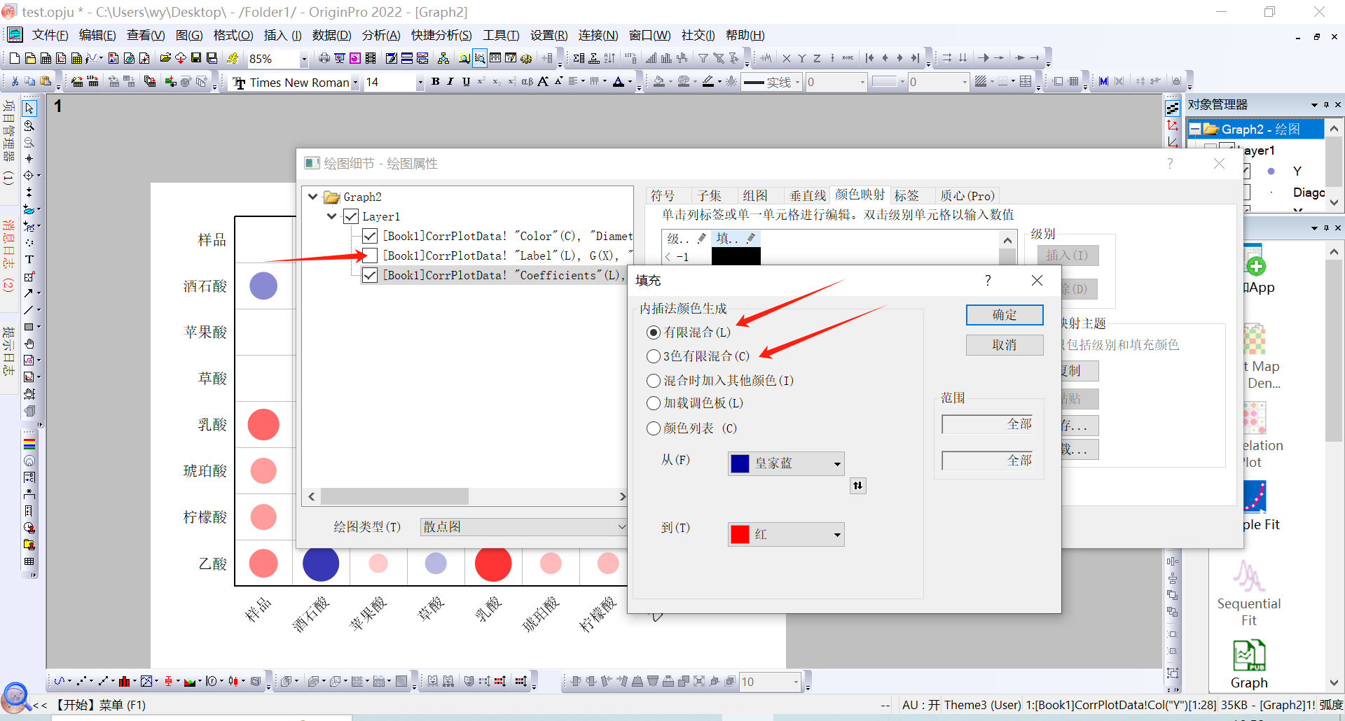 spss同样是相关性分析的主流工具之一,结果数据可以利用origin进行绘图美化,其最大优点是可以实现相关性数据的选择,分块比较,横纵坐标可以不一致,比如可以选择风味物质与优势微生物菌属的相关性分析,而不呈现风味物质内部或微生物菌属内部的相关性,这样的数据与图更加简洁,不臃肿,下图就是示例(如果放一块,那么横纵坐标就各有11个名称了)。视频教程推荐https://www.bilibili.com/video/BV1xT411s7so/