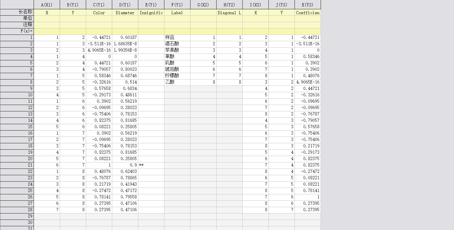 按图1所示导入数据,图2为插件自动计算相关性系数后的数据表格