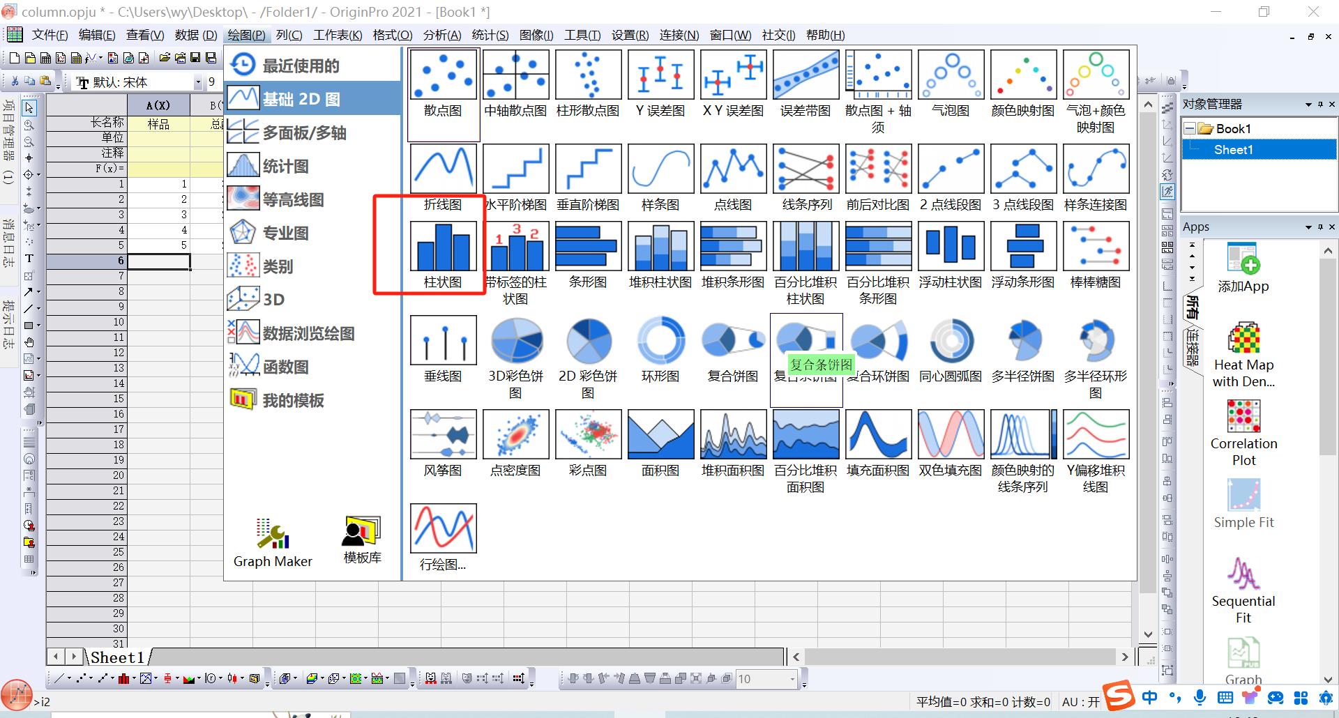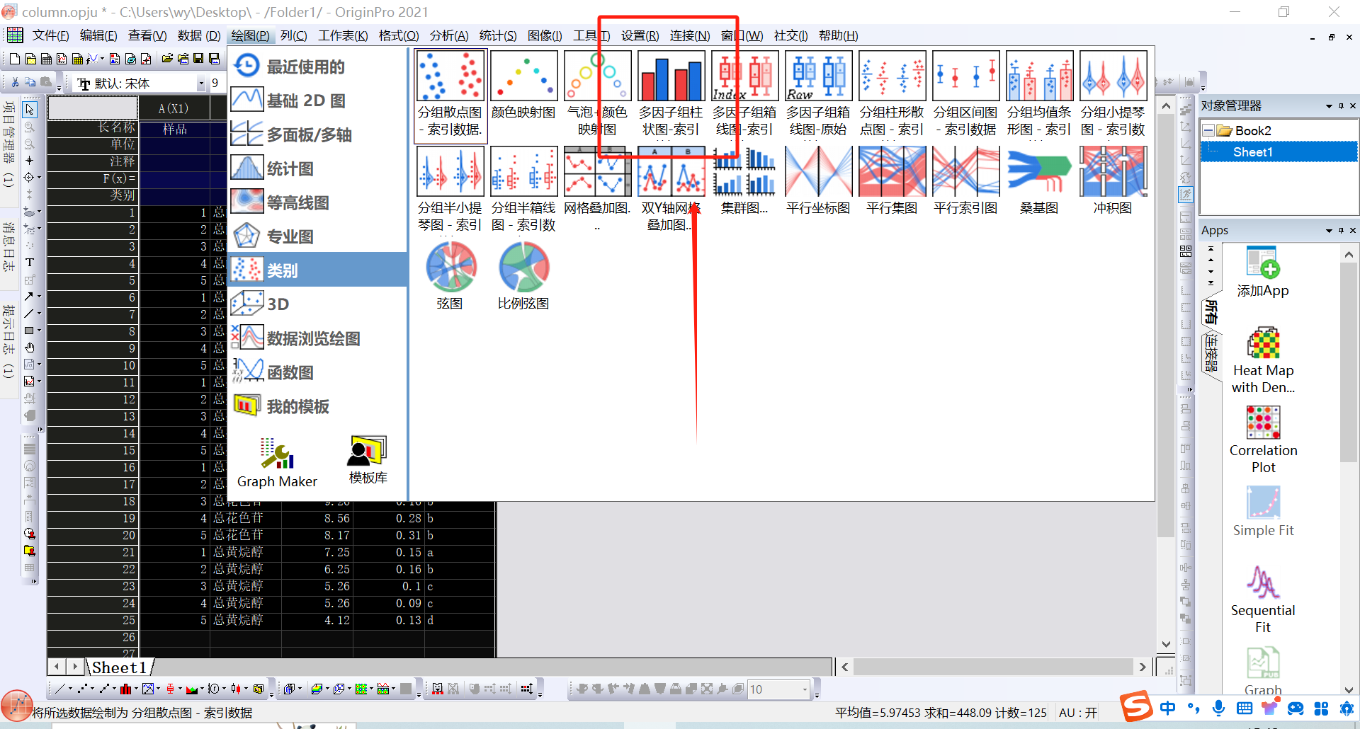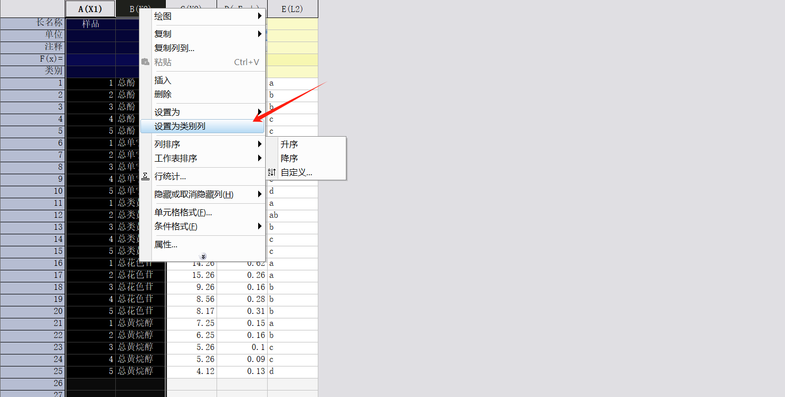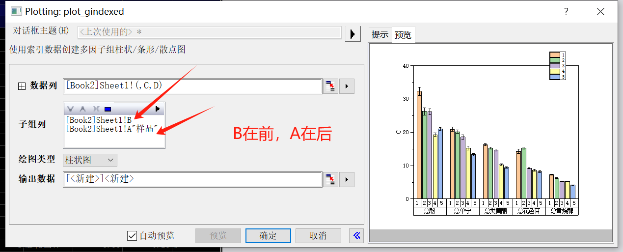 首先按图1所示输入数据,改变变量的类型,并将前两列选中右键设置为类别列。这样之后开始绘图,选择多因子组柱状图-索引,在提示框内选择子组列,这里B列一定要在A列排序前面,否则画出来的图和上面的例图就没有差异了。