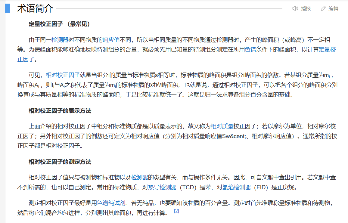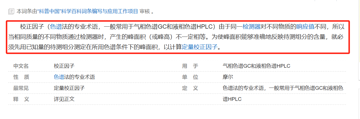 由于同一检测器对不同物质的响应值(即为某一物质在检测器所产生的信号强度、包括电信号,峰高,峰面积等)不同,所以当相同浓度的不同物质通过检测器时,产生的峰面积不一定相等,这种情况下使用峰面积进行反映待测组分的含量就会出现误差。所以为了消除这个误差,需要加入一个校正值,使得相同浓度的不同物质通过检测器时的峰面积经过校正后可以定量的代表物质的含量,这个校正值就是我们常提到的校正因子。