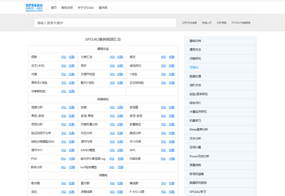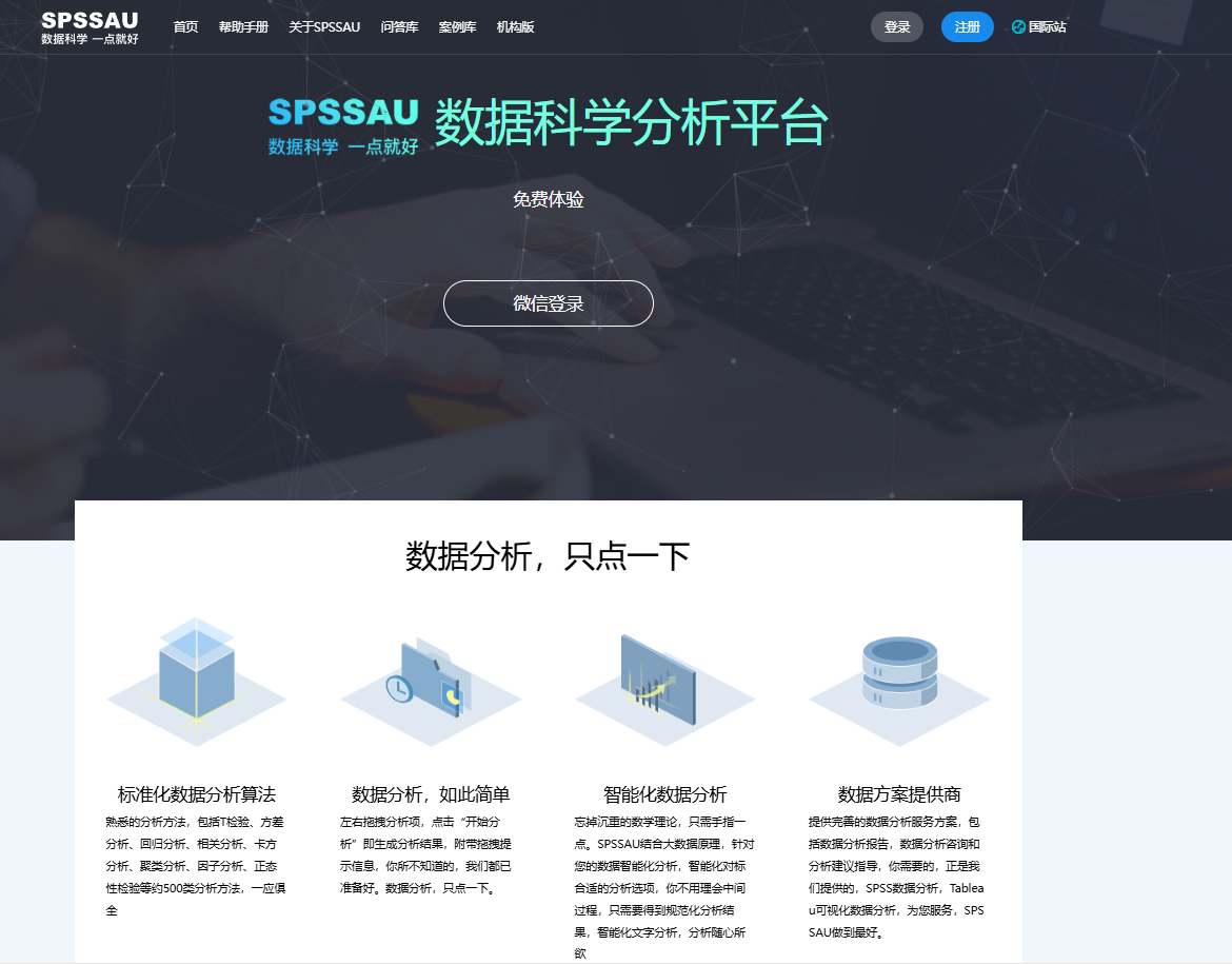今天给大家推荐一个在线的数据分析网站SPSSAU,对标的应用端IBM SPSS,功能齐全,只要按要求上传数据,即可一键快速分析,得到智能化的解读,并且每种数据分析功能都有相应的教学视频,真正做到了保姆级的数据分析体验。当你还在为正版SPSS订阅价格高、盗版有起诉风险、软件上手难度高等问题发愁时,SPSSAU则带你轻松、靠谱、免费地实现范式的数据分析,强烈建议收藏使用。