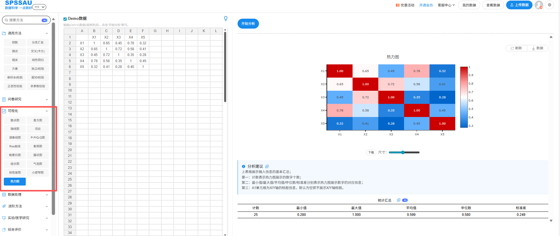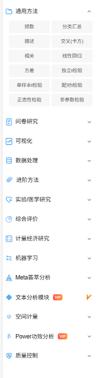 上百种统计分析方法任你选择,显著性检验、相关性分析、机器学习、综合评价等一应俱全,还能进行数据的可视化绘图