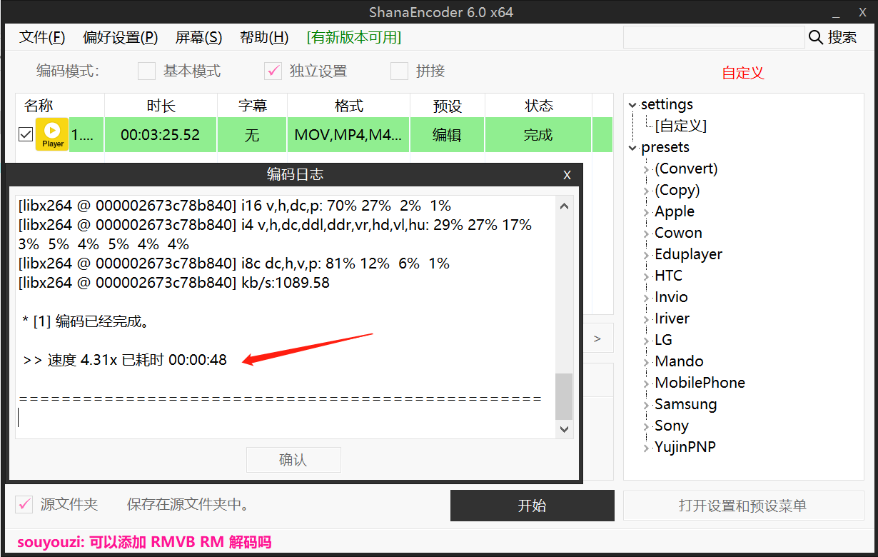 ShanaEncoder现在有5.3和6.0版本,都可以流畅使用,推荐最新的版本,官网下载即可,但速度比较慢,不过网上资源也挺多的,百度一下就能搜到,如:ShanaEncoder v6.0