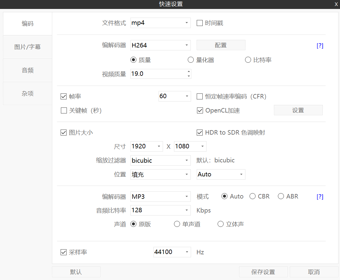 懒人操作,直接上传(支持鼠标拖拽)视频文件,然后快速设置,格式为MP4,视频质量选19(数值越高,画质越好,相应文件大小会增加),勾选OpenCL加速,声道选择原版,其余默认就好,然后保存设置开始视频压缩。如果你有更复杂的需求,可以自行百度相应教程,这里我就不赘述了。
