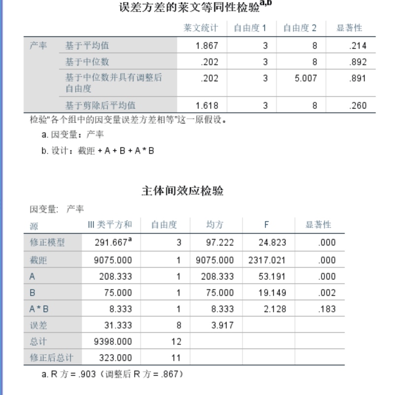 结论:反应浓度(A)高低和是否使用催化剂(B)对产率具有显著影响,但两者的交互作用对产率的影响不显著。