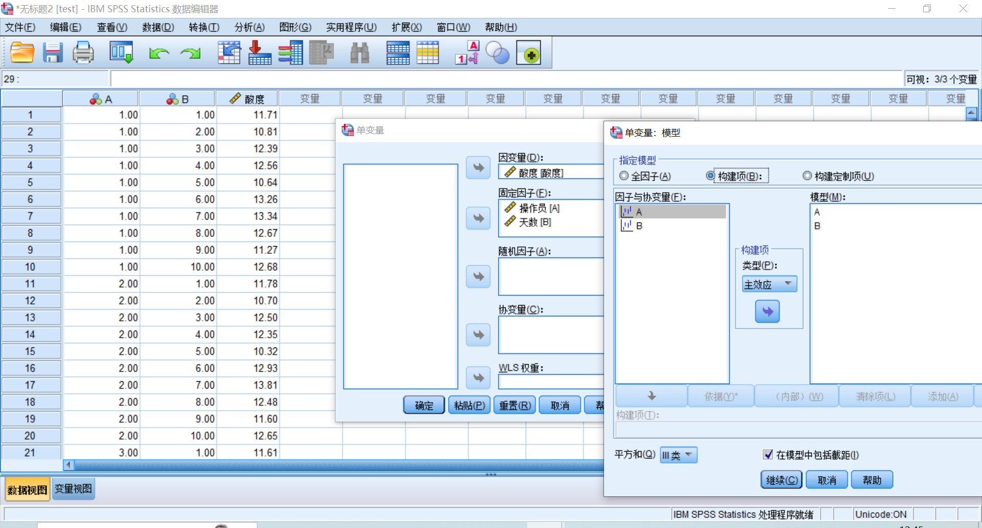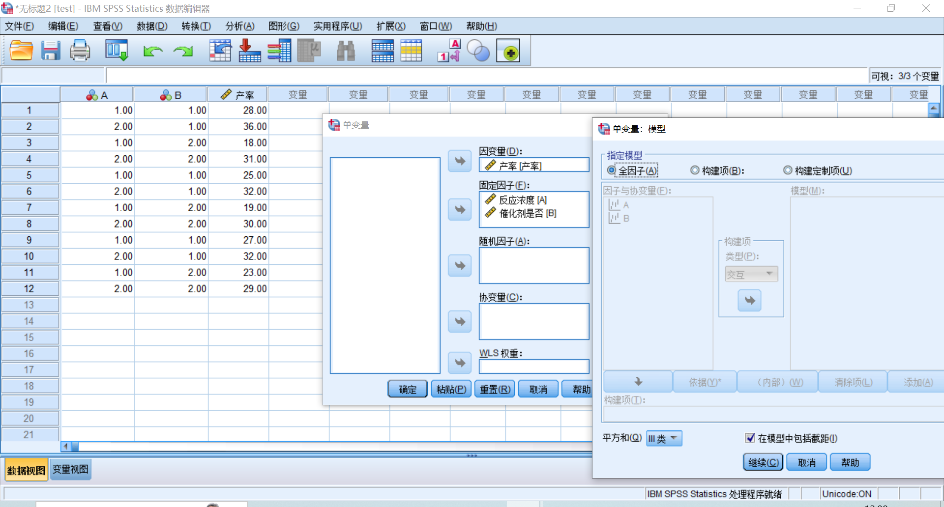 步骤:分三列(A,B,产率)输入数据,点击分析→一般线性模型→单变量→选择因变量与自变量→模型中选择全因子→选项中勾选“描述统计”和“方差齐性检验”,“图“”将A,B选入水平轴和单独的线条,“EM平均值”选入因素A,B→确定。