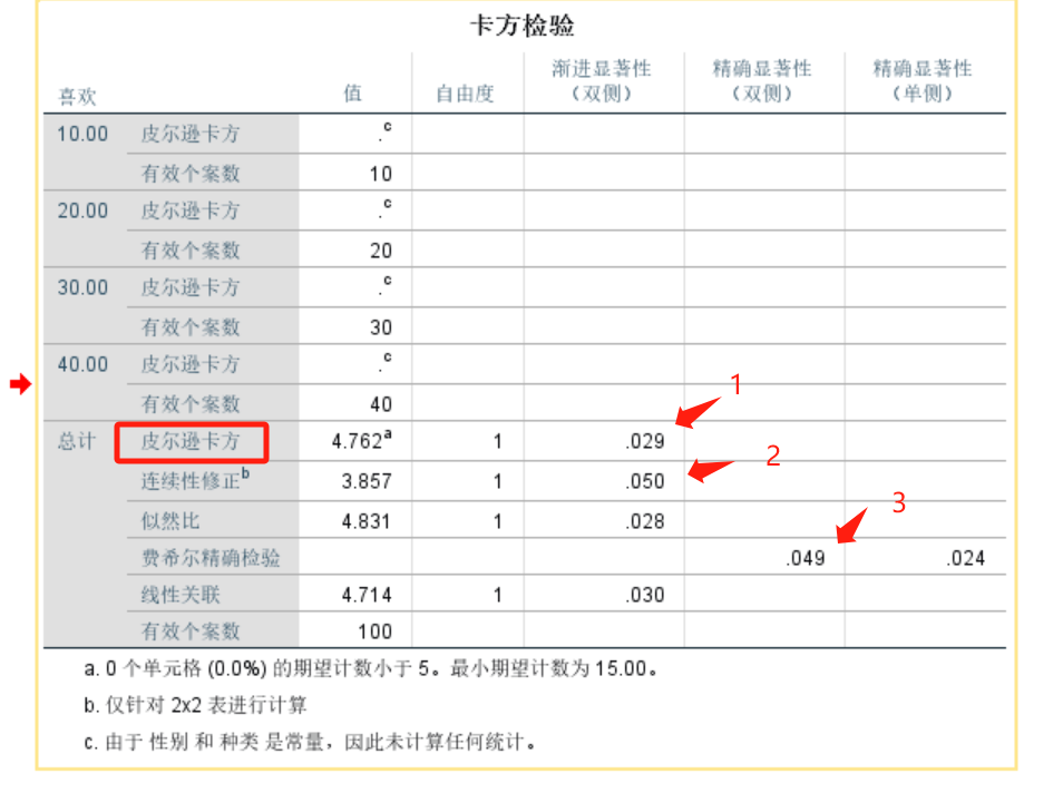 结论:当最小期望计数>5,看第一个数;1-5,看第二个数;<1,看第三个数。本案例中最小期望计数为15.00>5,应该看第一个数,所以P值为0.029<0.05,表示男女消费者对两类食品有不同的态度。