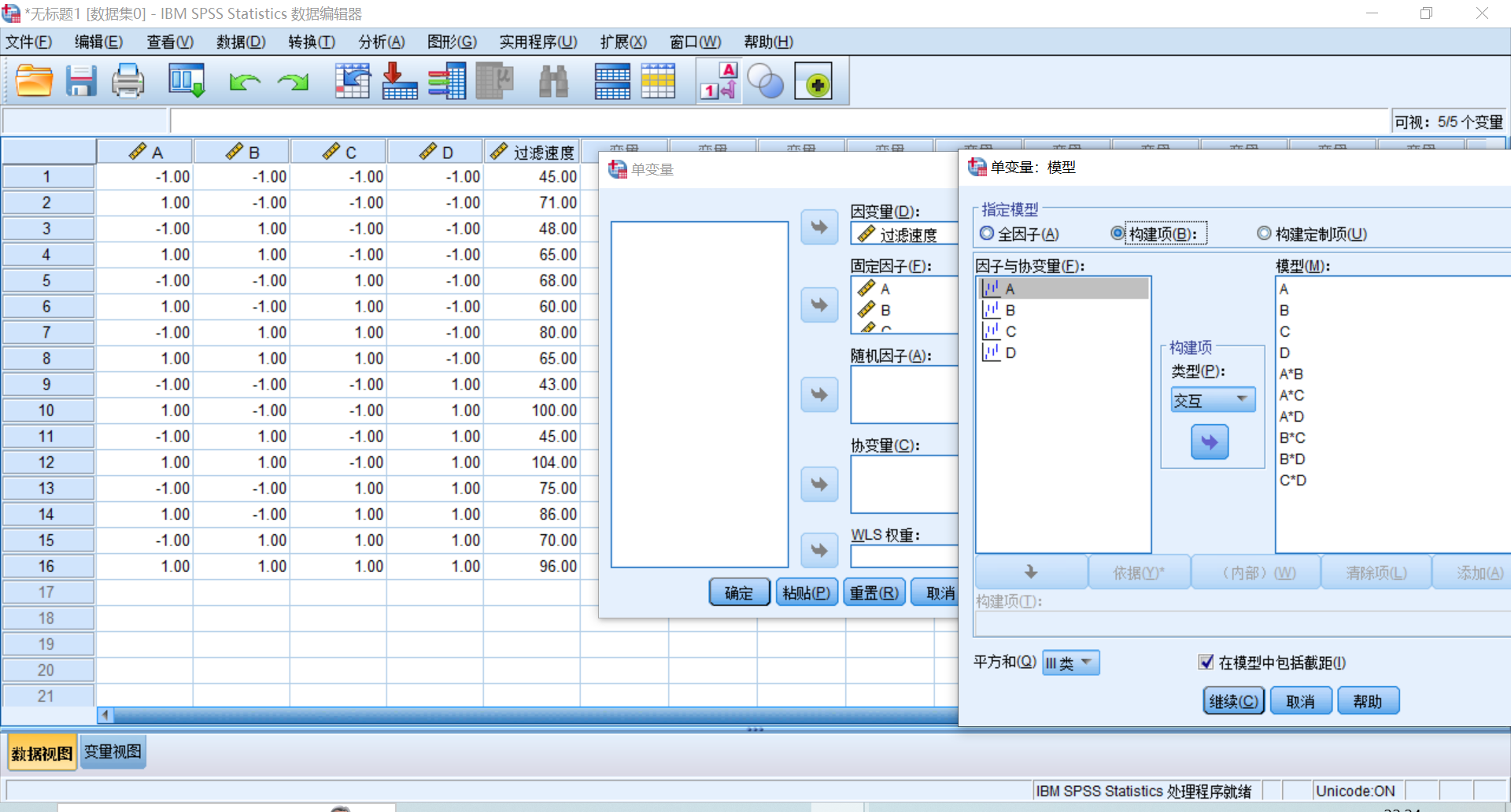 步骤:分五列输入因素和因变量数据,点击分析→一般线性模型→单变量→选择因变量与自变量→模型中选择全因子→选项中勾选“描述统计”和“方差齐性检验”,“图“”将A,B,C,D选入水平轴和单独的线条,“EM平均值”选入因素A,B,C,D→确定。