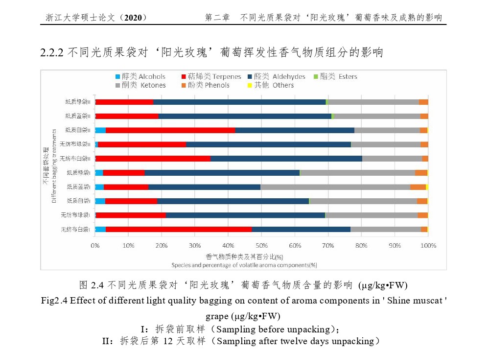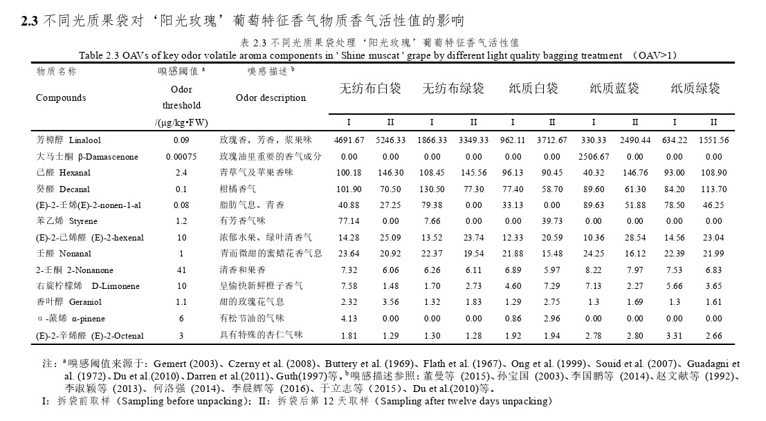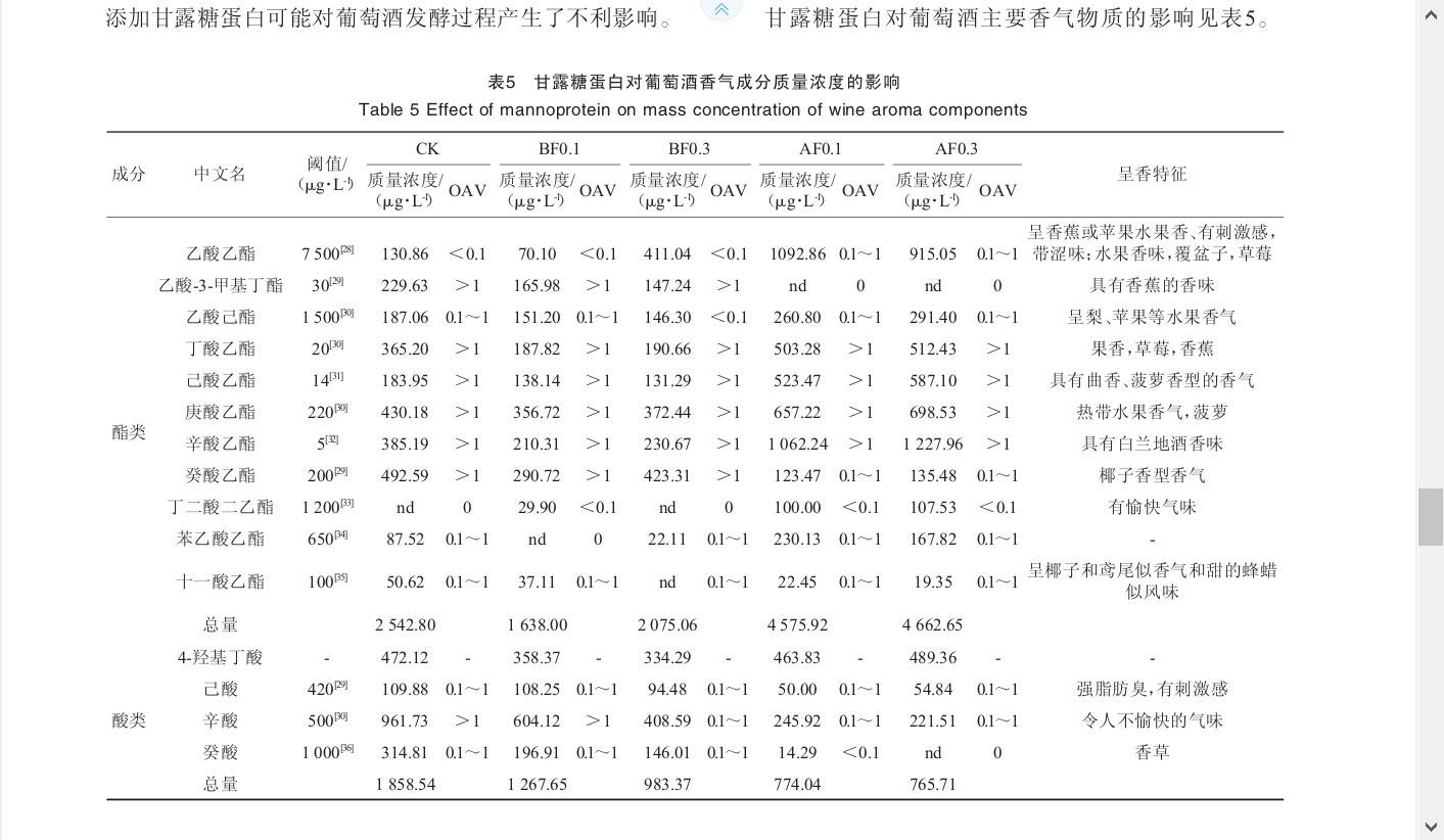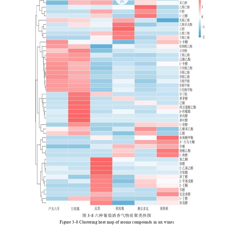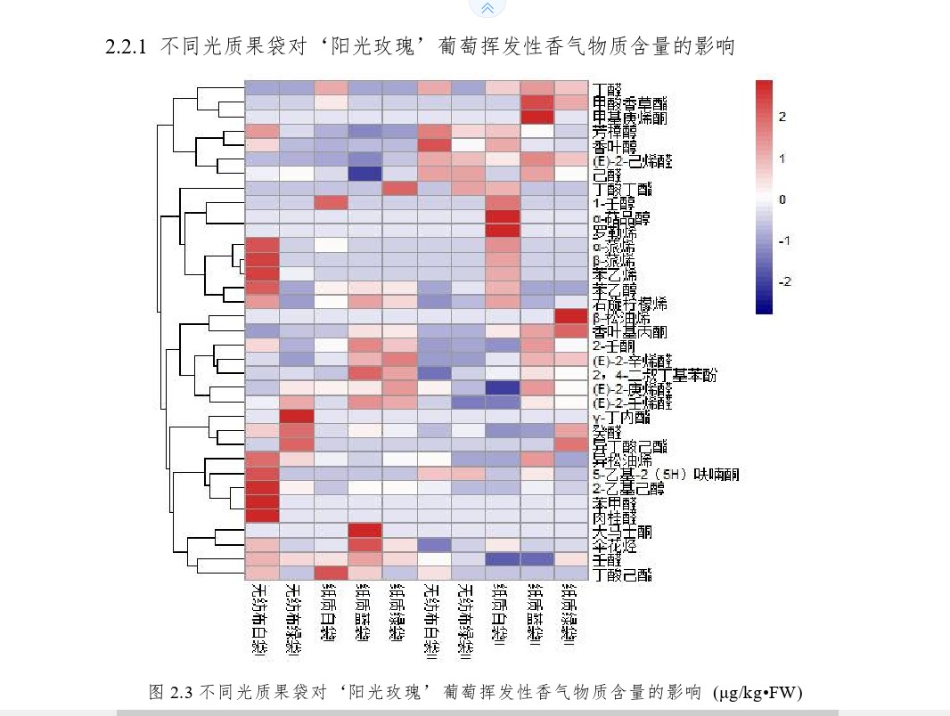计算好每个样品的香气物质含量及重复之间的均值和标准偏差,然后就可以对其进行分类,分类方式很多,需要根据样品的类型选择合适的分类方式。以阳光玫瑰葡萄果实香气为例,一般可以分为醇类、醛类、酯类、酸类、酮类、萜烯类和其他共七大类,这里的其他包括苯类衍生物、烯烃等复杂化合物,注意烷烃不属于香气物质,推荐查找文献参考多种分类方式。分类是一个工作量比较大的工作,这里有一些技巧,比如-al结尾的一般是醛类,-ol结尾的是醇类,带acid的一般是酸类或者某酸某酯,-one结尾的一般是酮类,-ate结尾的一般是酯类,ene和ane一般是苯环衍生物、烯烃或者烷烃。 香气能被人鼻子嗅出来,这里就得牵涉到香气阈值和气味活度值(OAV),这个工作量也比较大,得一个一个在文献或者网站查找,还需注意,不同物质在不同溶剂体系中的香气阈值是不同的,别找错了。上面两个我推荐的网站都可以查找香气物质的香型描述,可以记录下样品中主要物质的香气特征,方便进行后续的结果分析与讨论。