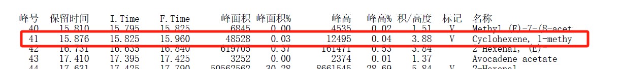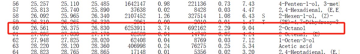 每种物质都有其对应的质谱信息,峰号与行号一一对应,命中1的物质谱库检索相似度最高,一般来说就是样品中的真正香气物质,记录下名称和CAS号,方便后续查找香气特征。
