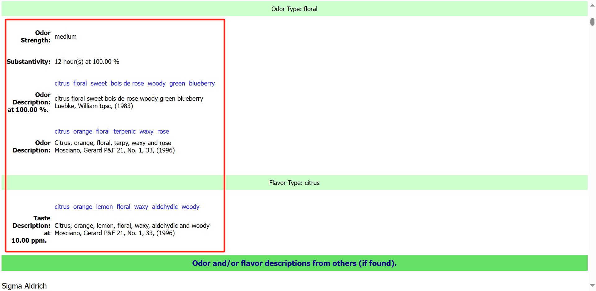 另外一个是国外的perflavory(http://www.perflavory.com/),网站上的每种香气物质都有其文献索引,其实chemical book就是从这个网站上爬取的数据,可以说是中文版。
