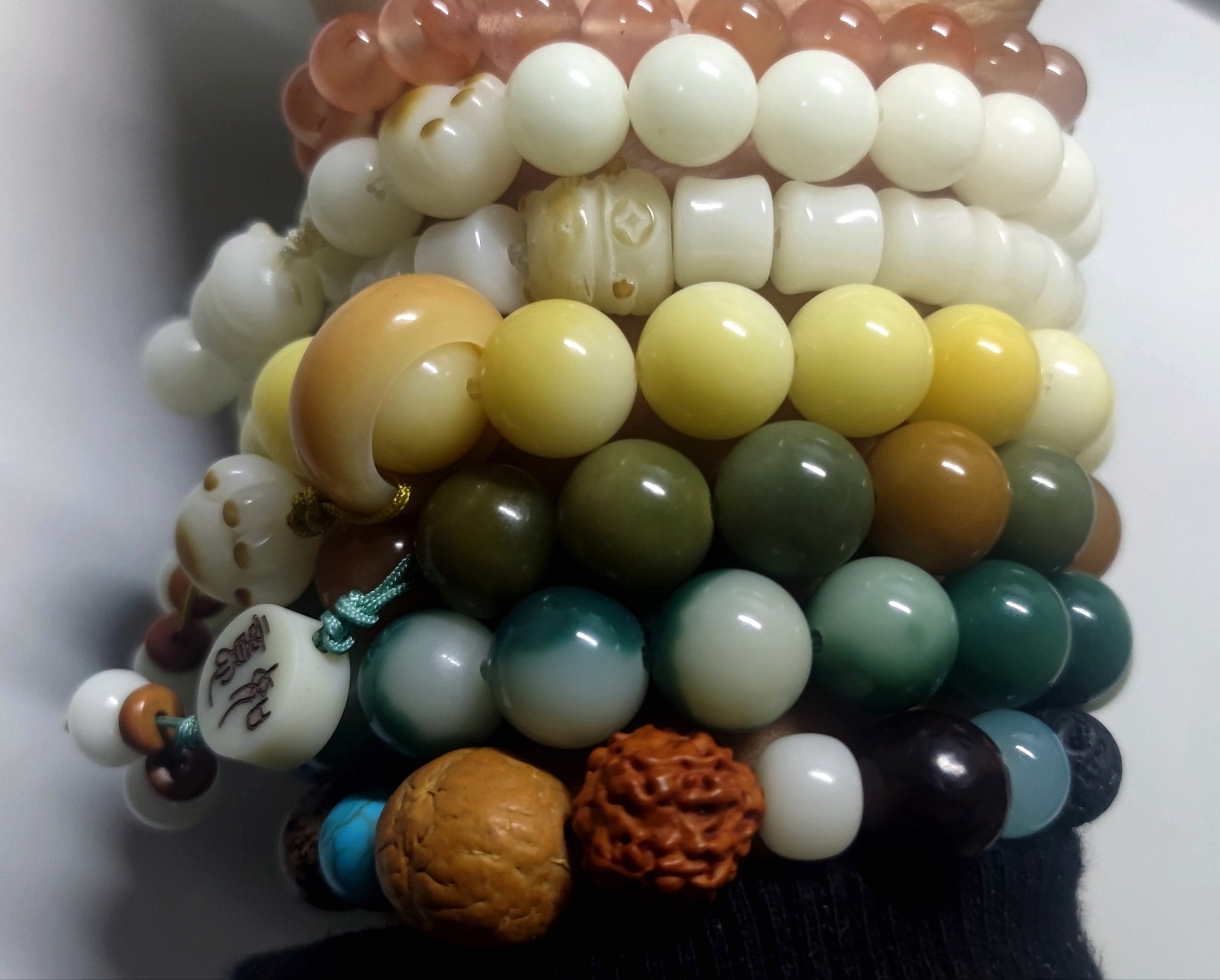 菩提根手串上色简单,淘宝和拼多多上的菩提根手串颜色款式绝对会让你眼花缭乱。菩提根本身油性密度都很好,前期素白光洁、中期油润温黄、后期包浆开片,价格低廉,上手难度低,盘坏了,几块到十几块再买一串接着穿戴接着盘就行,可玩性很高,不过一定要注意防水。